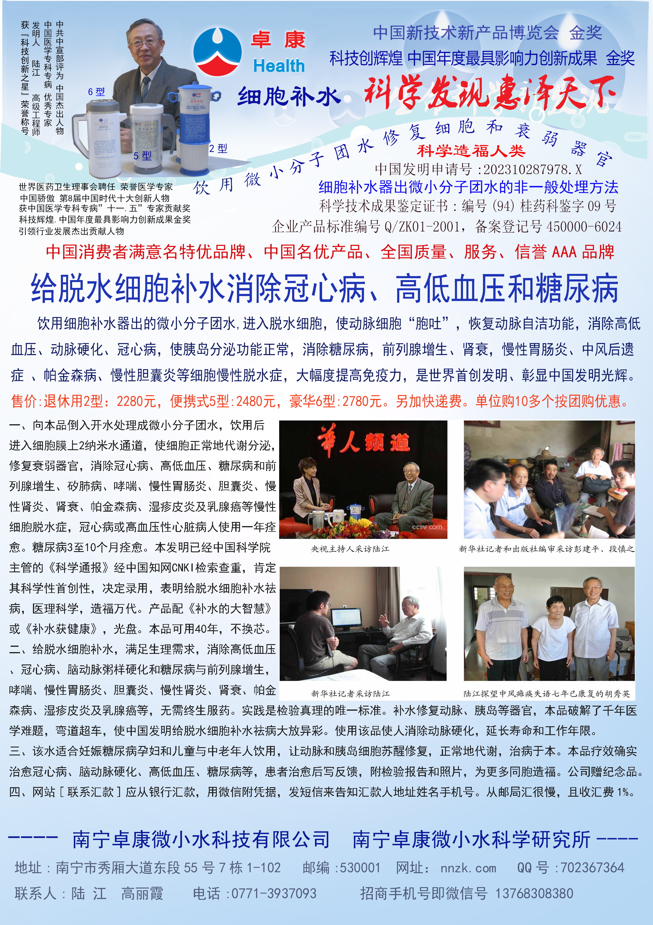 人類幾千年來患以上病癥需終生服藥,幾十年也不能治愈。可是我國南寧的高級工程師陸 江,于1990年想根治高血壓,研究發(fā)明了離子水瓶,處理出微小分子團水供飲用,經(jīng)過醫(yī)院臨床試用和專家鑒定,1999年獲中國發(fā)明專利權(quán),產(chǎn)品于2000年投放市場后一直跟蹤調(diào)查,據(jù)全國各地用戶反饋:祛除了高低血壓、糖尿病和冠心病,并使前列腺增生、咽喉炎、鼻竇炎、慢性氣管炎、支氣管炎、矽肺病、哮喘、慢性胃炎、腸炎、慢性膽囊炎、慢性腎炎、腎衰、膀胱炎、便秘、痔瘡、風濕性關(guān)節(jié)炎和濕疹皮炎及中風后遺癥等病癥不藥而愈。為什么喝微小水能治20多種病?陸 江從1991年德國科學家發(fā)現(xiàn)細胞膜水通道僅為2納米獲得啟發(fā),認為多種器官患病是因細胞脫水,不能正常代謝和分裂增殖,才使器官細胞減少致衰弱萎縮而形成細胞缺水性病癥。22年來的實踐有力地支持了“細胞脫水致病”這一重要論點,表明喝微小水可滿足細胞的生理需求,補水就能祛病,是生命科學新亮點。